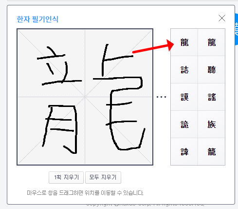 무료 한문 번역기의 한자 필기인식 창에 마우스의 왼쪽클릭으로 한자를 써보세요. 그러면 가장 유사한 획과 형태를 지닌 한자가 우측에 나오게됩니다. 그것을 클릭하면 검색창에 자동 입력이 되고, 엔터를 치면 한자의 뜻과 음을 확인할 수 있습니다. 아래에는 그 한자가 쓰이는 "단어"의 예시도 확인할 수 있습니다.