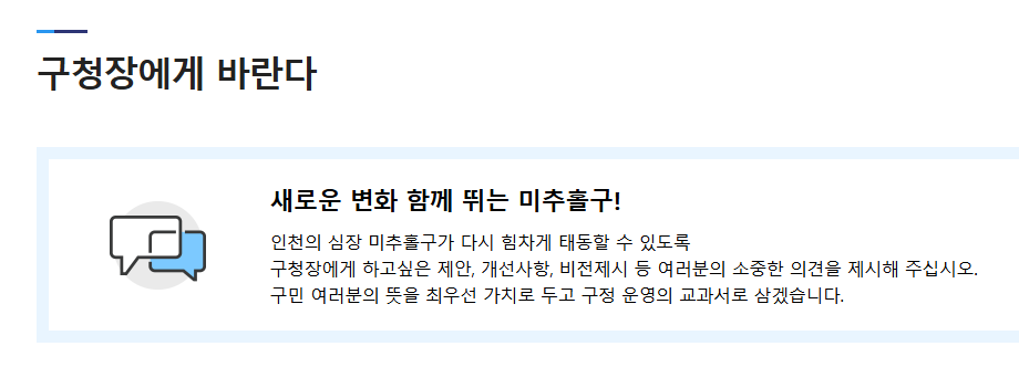 마지막으로 미추홀구청 홈페이지 바로가기 "소통참여" 코너를 통해 다양한 구민 참여 공간을 이용할 수 있습니다. 구청장에게 바란다, 자유게시판, 설문조사 등 다양한 채널을 통해 구민들의 의견을 수렴하고 있죠. 또한 주민참여예산, 정책제안 등을 통해 구정에 직접 참여할 수 있는 기회도 제공되고 있습니다. 이러한 참여 공간을 통해 구민들의 목소리가 구정에 반영되고, 더 나은 미추홀구를 만들어갈 수 있을 것 같습니다. 구민 여러분들도 이런 참여 공간을 적극 활용해보시는 것은 어떨까요?