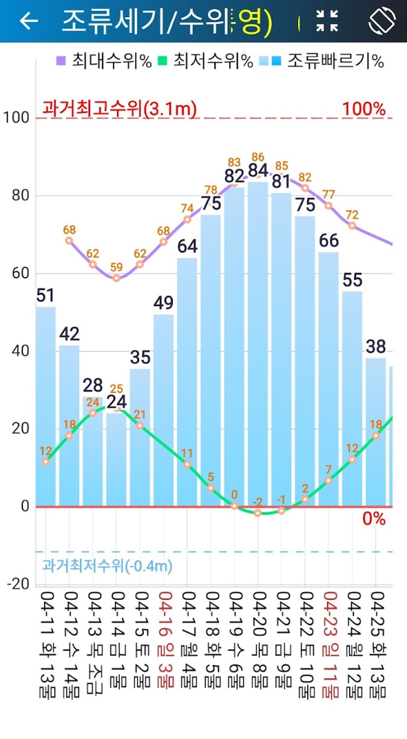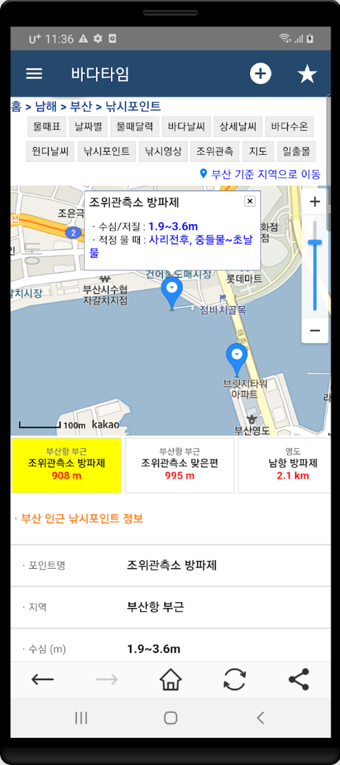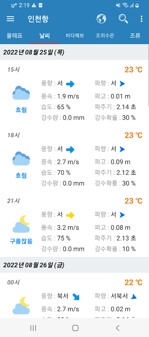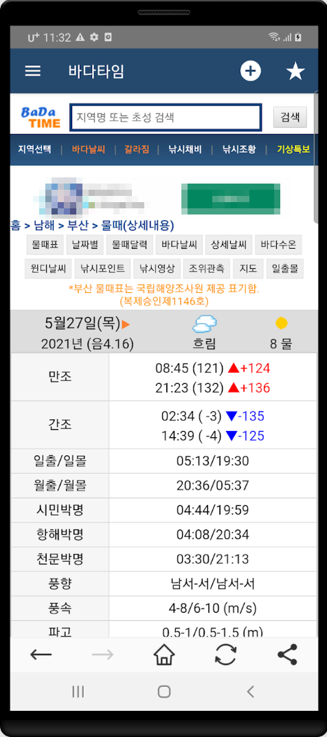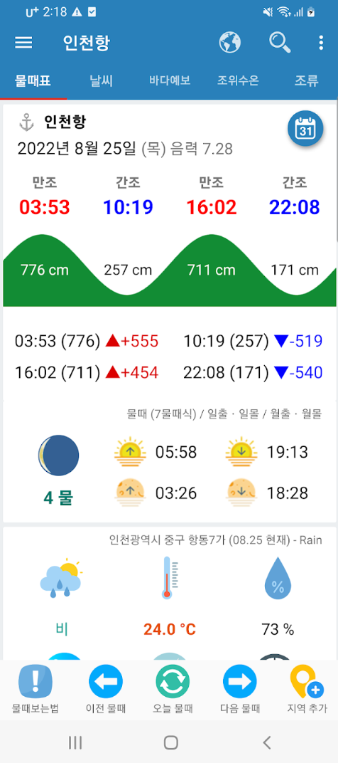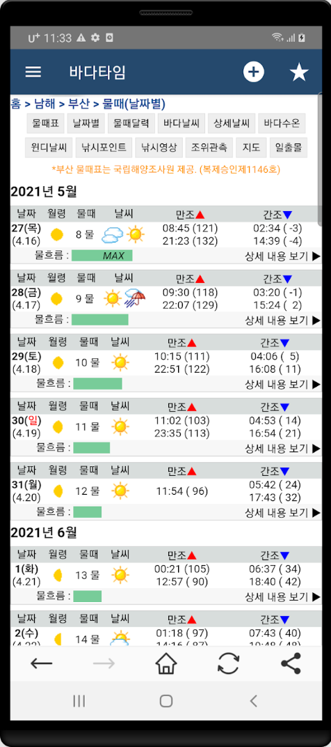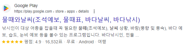 물때와날씨 앱은 100만명 이상이 다운로드한 안드로이드 어플입니다. 바다낚시 하시거나 해양 레저활동을 계획하는 데 필수적인 정보를 제공하고 매우 디테일합니다. 이 앱은 내일 뿐만아니라 주간, 주말의 날씨 상황도 파악할 수 있습니다. 또한 조석 예보와 물때 정보, 그리고 주변 해역의 날씨 상황을 확인할 수 있습니다. 특히 낚시꾼들에게 유용하며, 지역별 상세 날씨 정보도 제공해 일정 계획에 큰 도움을 받으실 수 있습니다.