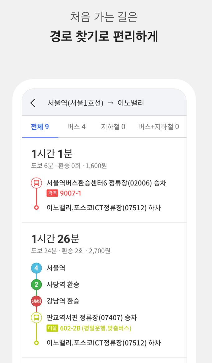 마지막으로 소개해드릴 버스 노선 검색 방법 중 하나는 전국 스마트 버스 어플입니다. 이는 서울, 경기, 인천을 비롯한 수도권 지역뿐만 아니라 강원도, 충청도, 경상도, 전라도, 제주도 등 전국의 시내, 마을, 공항 버스 노선 정보를 포괄적으로 다룹니다. 사용자는 실시간으로 버스의 도착 정보, 위치 확인이 가능하며, 버스가 어디쯤 있는지, 몇 분 후에 도착하는지를 한눈에 파악할 수 있습니다.