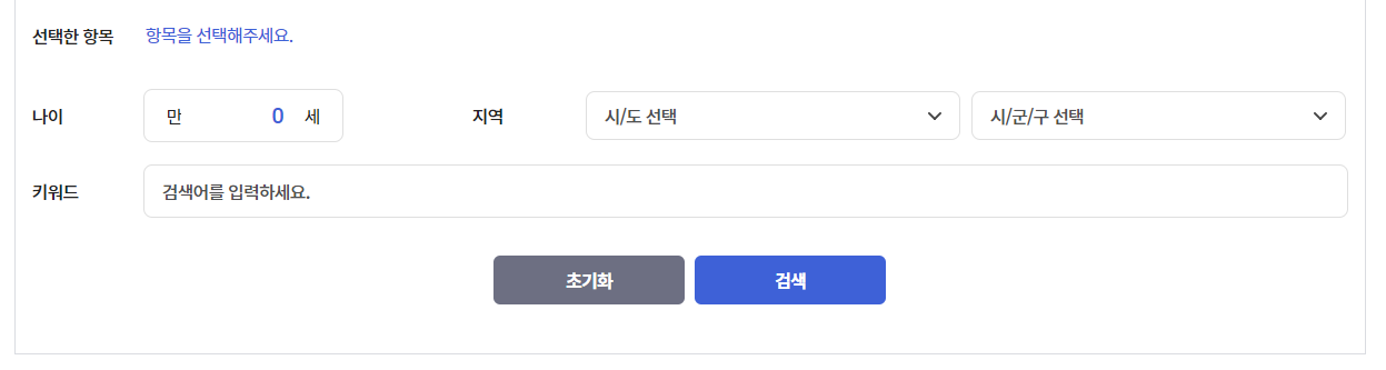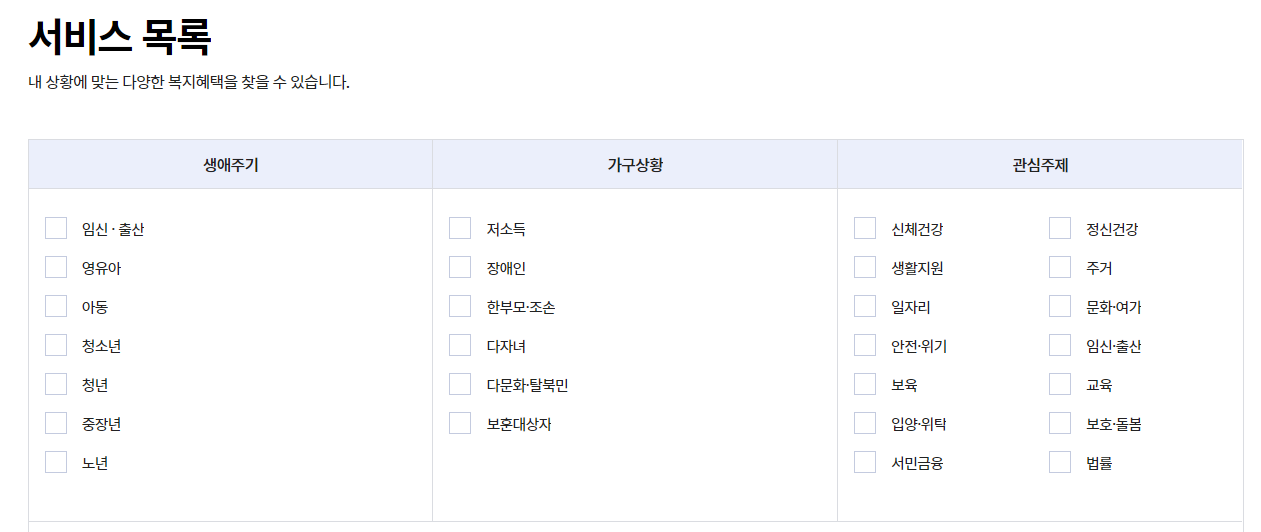 3. 서비스 목로에서 생애주기, 가구상황, 관심주제에 맞게 선택한 뒤 본인의 나이, 지역(시/도, 시/군/구)를 선택합니다.