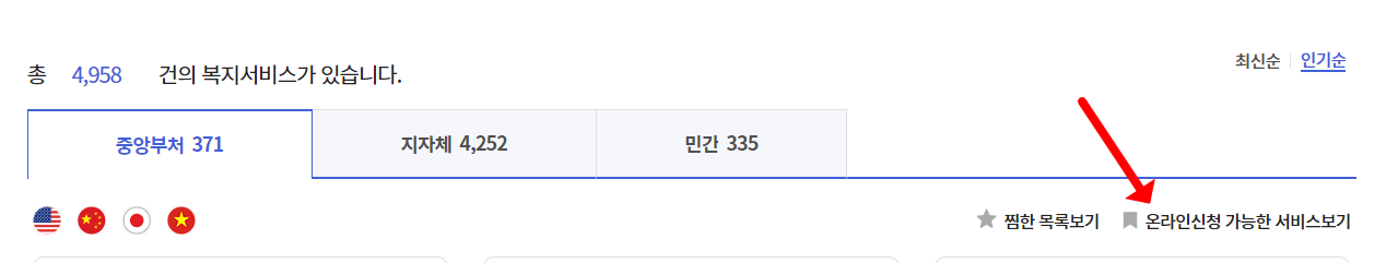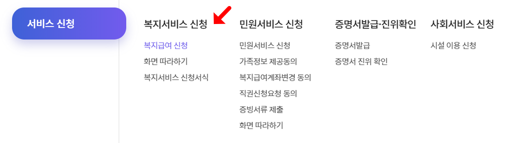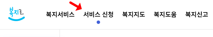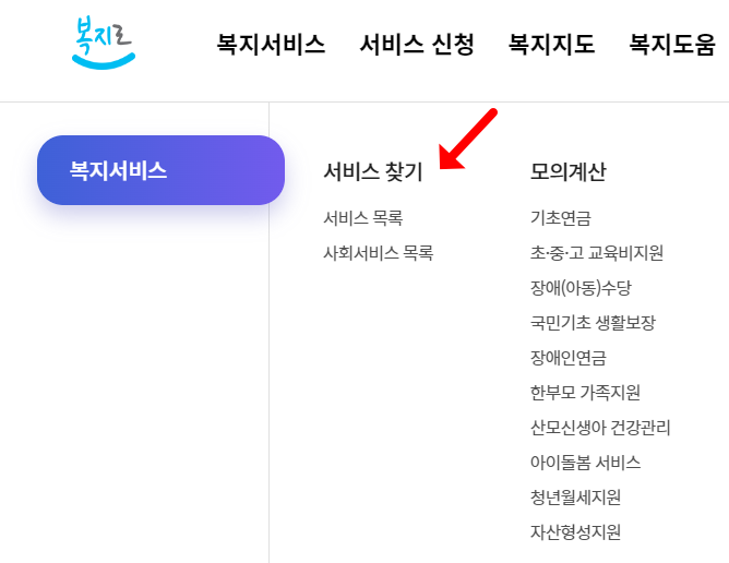 2. 전체 서비스를 검색하고 싶다면, "복지서비스" > [서비스찾기] 탭에서 "서비스 목록" 을 클릭합니다.