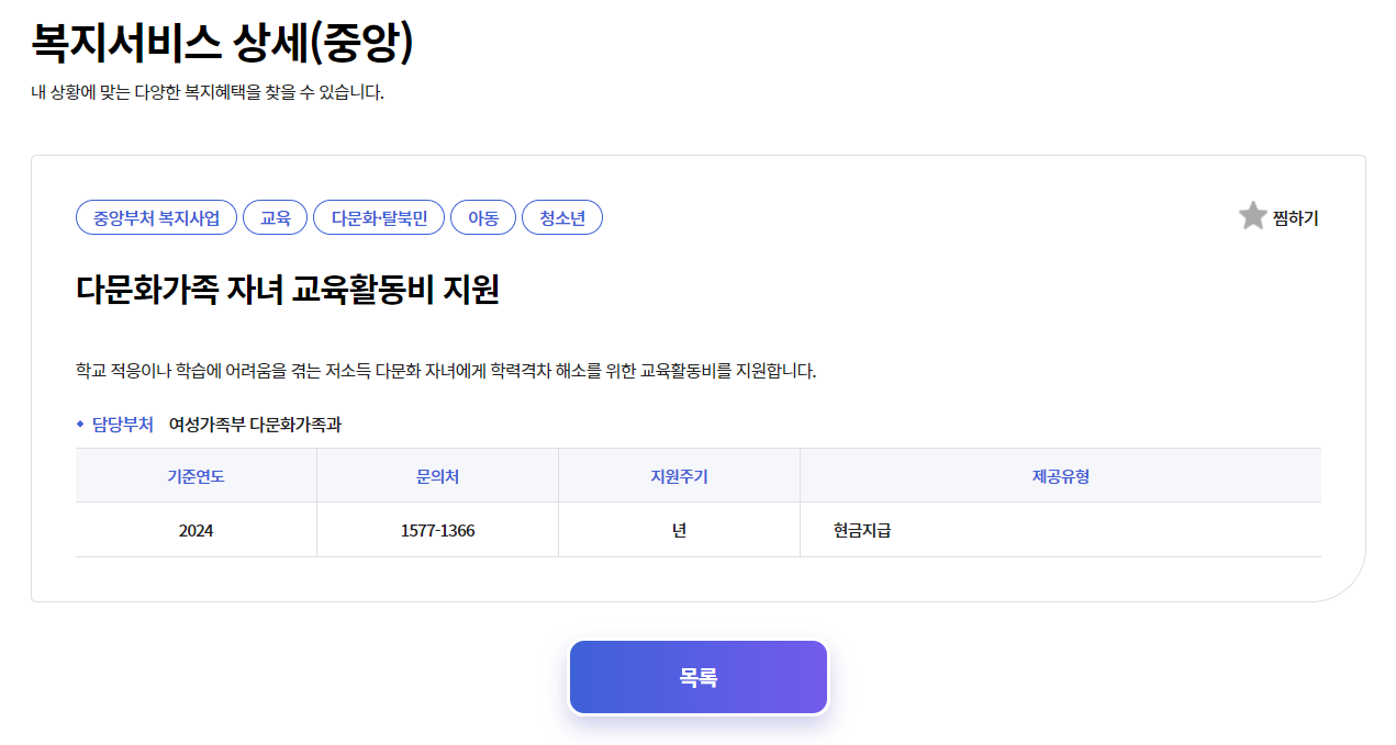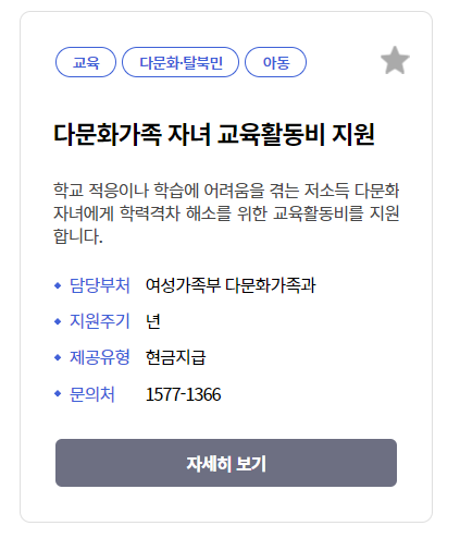 복지로 홈페이지 (bokjiro.go.kr) 에서 가장 많이 조회되는 서비스 중 하나인 다문화 자녀 교육활동비 지원은 저소득 다문화 가구의 7세에서 18세 이하 자녀를 대상으로 학업과 진로 역량 개발을 지원하기 위한 정부 프로그램입니다. 이 지원은 교재 구매, 독서실 이용, 예체능 및 직업 훈련 실습 재료 구입, 자격증 취득 지원 등 교육 관련 활동에 사용할 수 있습니다​.