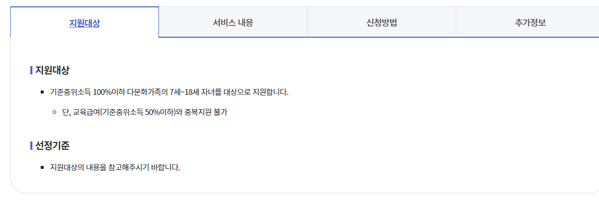 • 지원 금액: 연령에 따라 다름; 초등학생은 연 40만 원, 중학생은 연 50만 원, 고등학생은 연 60만 원