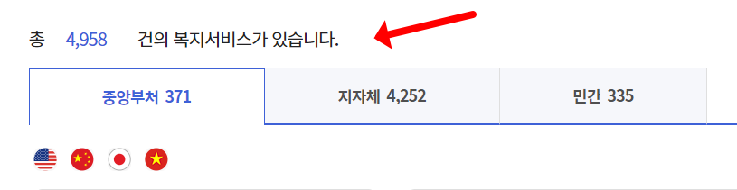 4. 검색을 누르면 자신의 상황에 맞는 복지서비스가 나오게 됩니다. 기본적으로 약 5000개에 달하는 복지서비스가 존재합니다.