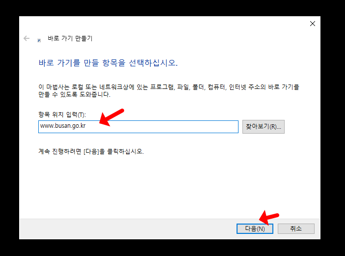 - 부산시청 홈페이지 바로가기 주소인 www.busan.go.kr을 "항목 위치 입력" 란에다가 넣고 다음을 눌립니다.