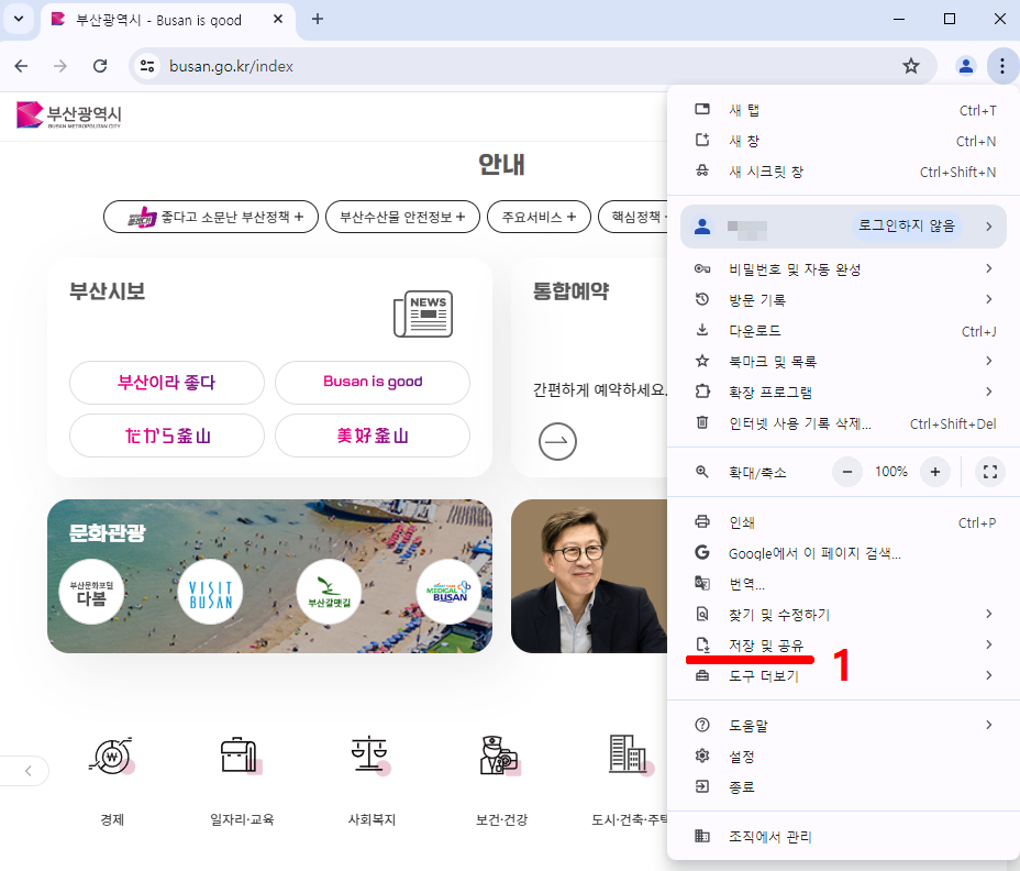 - busan.go.kr 홈페이지를 열어둔 상태에서 우측 상단의 "⋮" (세로줄임표) 버튼을 누릅니다.