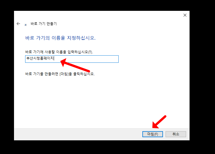 - 아이콘 이름을 지정해주세요. 식별하기 좋게 부산시청 홈피 등의 이름으로 지어준 뒤, "마침"을 누릅니다.