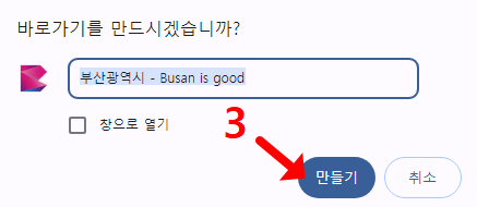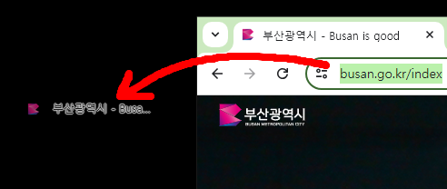 이 방법은 첫번째 방법에 비하면 약간 번거롭습니다만, 부산시청 홈페이지 바로가기 아이콘의 "이미지"까지 만들 수 있습니다. 그래서 개인적으로는 이 두번째 방법을 추천드립니다.
