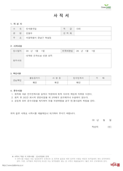 사직서 양식 무료다운 hwp에서 가장 중요한 부분은 사직 사유를 작성하는 란입니다. 여기에는 간단하면서도 명확하게 사직 이유를 적어야 합니다. 예를 들어, "개인 사정으로 인한 퇴사", "일신상의 이유" 등과 같이 간략하게 작성하는 것이 좋습니다. 너무 상세한 설명은 피하는 것이 좋지만, 경우에 따라서는 조금 구체적인 이유를 적을 필요도 있습니다. 가능한 긍정적이고 객관적인 이유를 기재하는 것이 좋습니다.
