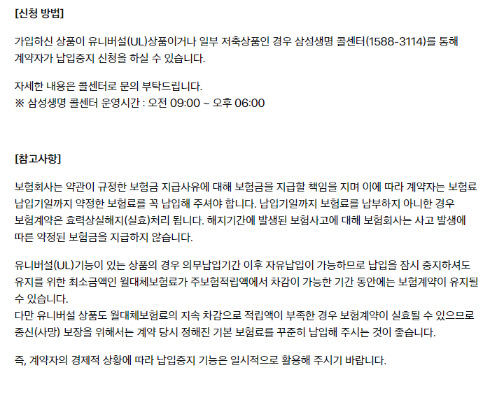 - A: 예, 가능합니다. 유니버설(UL) 보험 상품이나 일부 저축상품을 가지고 계신 경우, 삼성생명 고객센터 전화번호(1588-3114)로 연락하여 납입 중지를 신청할 수 있습니다. 보다 자세한 사항은 콜센터에 문의해 주세요.