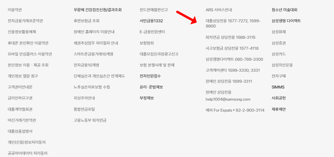 먼저, 통합고객센터 라는 이름을 운영되는 이 곳의 전화번호는 "1588-3114" 입니다. 해외의 경우에는 For Expats 82-2-900-3114 라는 번호를 사용중입니다. 이 콜센터의 운영시간은 09:00~18:00 까지입니다. 이외에도 홈페이지에 접속하여 가장 하단의 메뉴를 열어보면 여러가지 삼성생명 ARS 센터의 번호들이 존재합니다. 대표적으로는 아래의 번호들이 있습니다. 더 많은 번호를 확인하시려면 상단 이미지를 참고하시거나 홈페이지를 직접 확인해보시는 것을 추천드립니다.