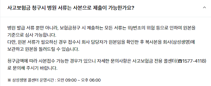 - A: 사고 보험금을 청구할 때는 위조 가능성 등을 고려하여 원칙적으로 모든 서류를 원본으로 제출해야 합니다. 하지만, 필요한 경우에는 접수 과정에서 삼성생명 담당자가 서류의 원본을 확인한 후, 원본은 고객님께 반환하고 복사본을 보관할 수 있습니다. 또한, 청구 금액에 따라서는 사본으로도 접수가 가능할 수 있으므로, 이와 관련된 자세한 사항은 삼성생명 고객센터 전화번호 중 사고 보험금 전용 콜센터(☎1577-4118)에 문의하시는 것이 좋습니다.