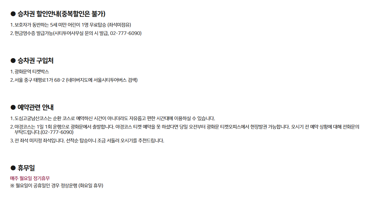요금은 코스에 따라 다른데요. 도심고궁남산코스는 성인 기준 30,000원, 야경코스는 27,000원입니다. 어린이와 청소년은 소인으로 분류되어 좀 더 저렴한 가격으로 이용할 수 있는 것으로 보입니다! 특히나 보호자가 동반하는 5세 미만 어린이 1명은 좌석을 미점유하는 식으로 무료탑승이 가능합니다.그리고 서울시티투어버스 티켓으로 제휴되어 있는 미술관, 식당 등에서 티켓을 제시하면 할인을 받을 수 있습니다. 이 점도 참고하시면 좋겠습니다.