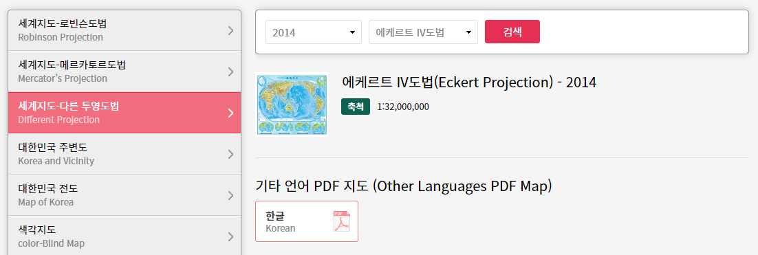 특히 세계지도 한글판을 다운로드 할 수도 있습니다. ngii를 가장 먼저 소개해드린 이유이기도 합니다. 지도는 PDF 파일로 공식 제공됩니다. 여기에는 로빈슨도법(Robinson Projection), 메르카토르도법(Mercator's Projection), 에케르트 IV도법(Eckert Projection) 의 지도자료가 있습니다. 상단의 다운로드를 누르면 바로 이용하실 수 있어요.