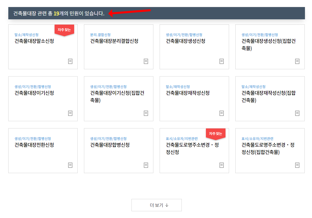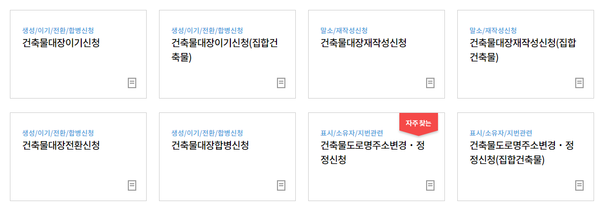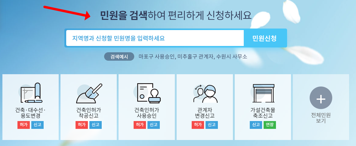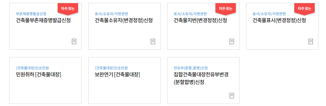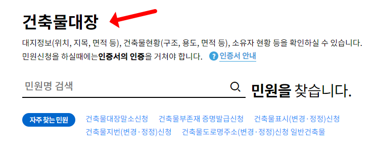 상기 제공드린 링크로 이동하셨다면 위와 같은 홈페이지 화면이 보이실 것입니다. 간략히 홈페이지 이용하는 방법을 설명드리도록 하겠습니다. 먼저 메인 화면에서 바로 보이는 "민원을 검색하여 편리하게 신청하세요" 라는 곳 아래에 검색창이 있습니다. 여기에 지역명을 입력하거나, 민원명을 입력하면 여러가지 민원 이용이 가능합니다. 아래로 스크롤을 한번 더 내리면 "자주 찾는 민원"으로 건축물대장, 현황도 발급까지 쉽게 하실 수 있습니다.