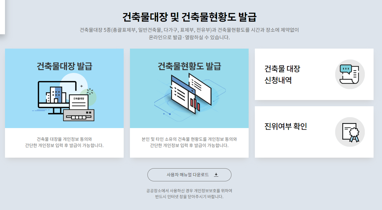 이 플랫폼을 통해 건축 관련 다양한 공식 문서를 온라인으로 발급받거나 관리할 수 있습니다. 예를 들어, 건축 허가서, 사용 승인서, 건축물 대장 사본 등을 요청하고 출력할 수 있습니다.