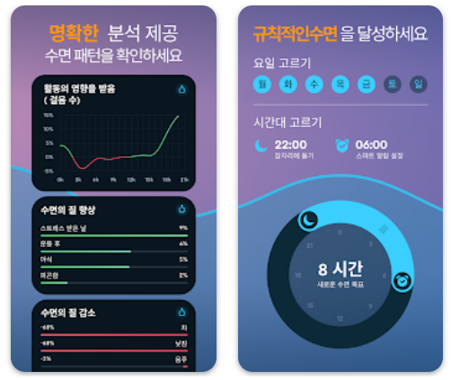 'Sleep as Android'는 수면 주기를 분석하여 최적의 시간에 알람을 울려주는 기능을 제공합니다. 이 수면 체크 어플은 사용자의 수면 중 움직임과 호흡을 감지하여 수면의 깊이를 분석하고, 스마트 알람으로 적절한 시간에 깨울 수 있도록 도와주는 기능이 있어서 굉장히 유용하죠. 또한, 노이즈 레코딩 기능을 통해 수면을 방해하는 소음도 파악할 수 있습니다. 허나 그 분석 정확도가 그리 높지 않다는 단점이 있다고 하니 참고하시기 바라요.