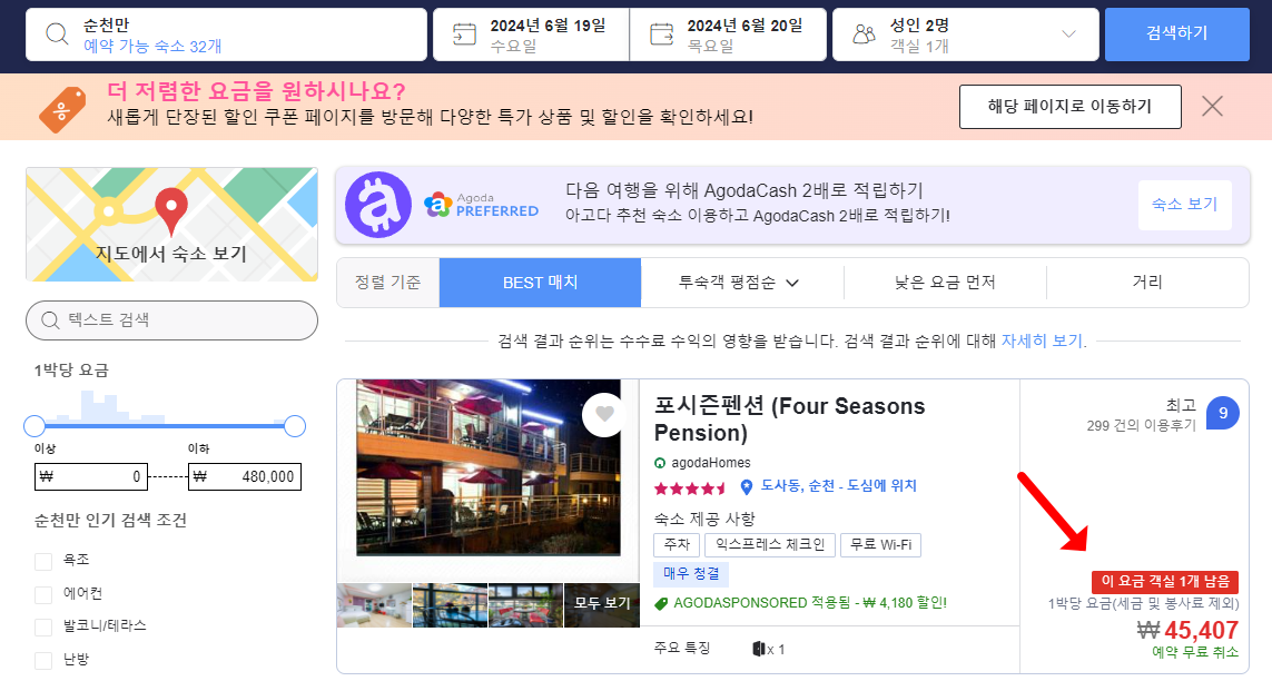 왜냐하면 아고다는 할인 혜택이 상시적으로 적용되는 경우가 많아 저렴하게 예약할 수 있다는 장점이 있기 때문인데요. 뿐만 아니라 순천만 국가정원 근처 숙박을 찾아 검색하실 때 여러가지 다양한 숙소 옵션(침대 크기, 금연, 바비큐 가능여부 등)을 체크해서 해당되는 숙소만 볼 수 있다는 것이 정말 효율적입니다. 그리고 사진을 많이 제공해줘서 숙소 컨디션 체크도 쉽죠. 사용자 리뷰를 찐으로 볼 수 있어서 평점을 통해 좋은 지 안좋은지 확인도 쉬워요!