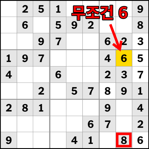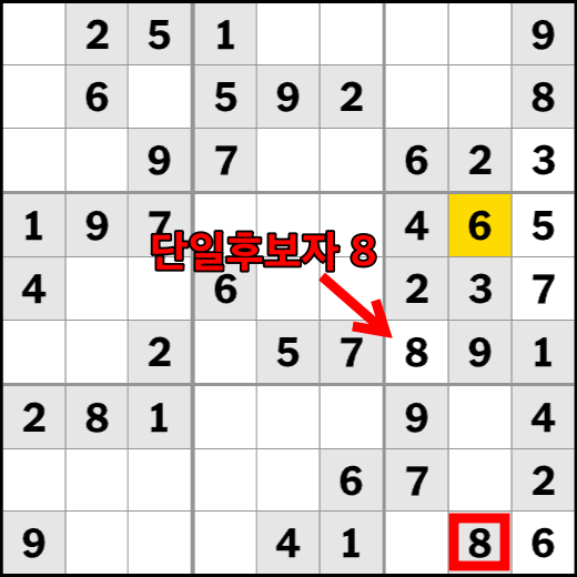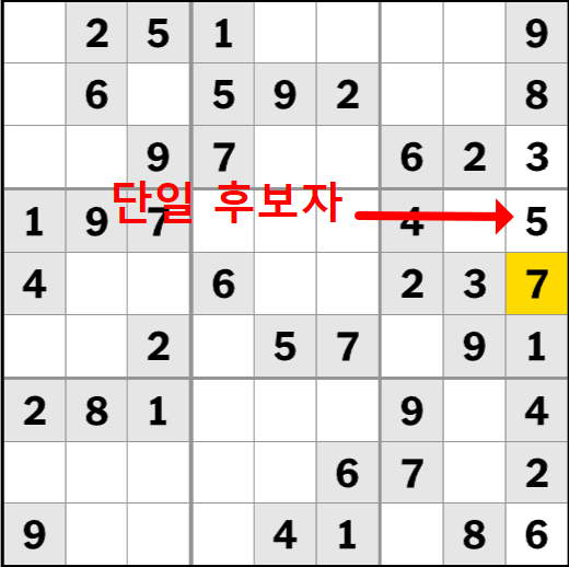 스도쿠 푸는 요령 방법 중 2단계입니다. 특정 칸에 들어갈 수 있는 후보 숫자가 하나밖에 없는 경우, 이를 '단일 후보자'라고 하는데요. 이는 그 칸에 들어갈 수 있는 숫자가 하나뿐이기 때문에 간단히 해결할 수 있습니다. 위의 예시의 경우 시작지점을 설정 하여 6을 넣었을 때 단일후보자 자리에 "3"이 오는 것은 불가능 하므로 무조건 "5"가 들어가게 되어있습니다. 이런 식으로 단일 후보자를 찾는다면 퍼즐 푸는 것이 쉬워집니다.
