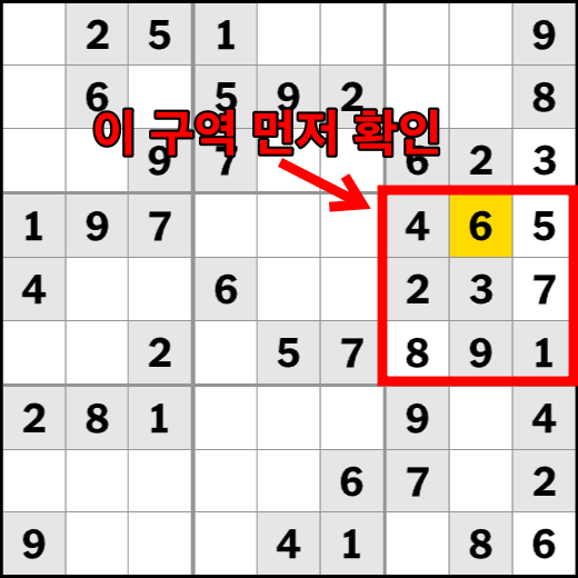 스도쿠 푸는 요령 방법의 3단계 입니다. 전체 퍼즐을 한번에 보려고 하지 말고 구역별로 즉, 행과 열, 박스를 차례로 확인하며 누락된 숫자를 찾아보세요. 퍼즐이 다 풀려갈 쯔음에 전체적으로 보는 것은 좋지만 초반에 그렇게 한다면 더 어려워집니다. 따라서 어떤 구역에서 시작할지 결정한 다음, 그 구역에 속한 숫자를 하나씩 채워 나가면서 퍼즐을 풀어나가는 것을 추천합니다.