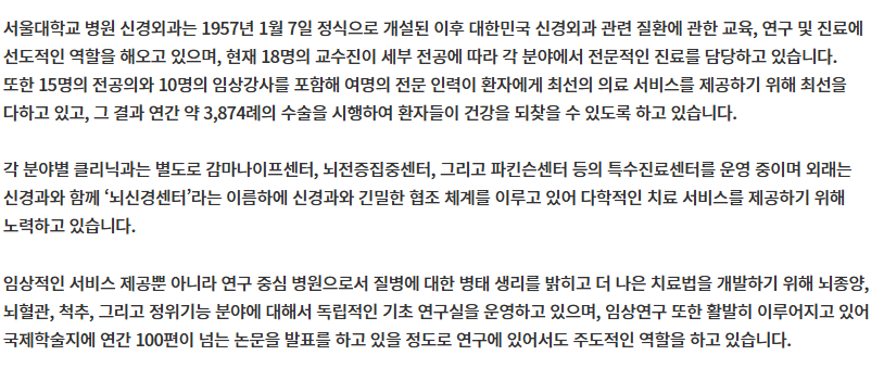 신경외과 진료 과목은 크게 뇌, 척추, 말초신경 세 가지 영역으로 나눌 수 있습니다. 뇌 영역에서는 뇌종양, 뇌출혈, 뇌동맥류 등을 다루며, 척추 영역에서는 디스크, 척추협착증, 척추종양 등을 치료합니다. 말초신경 영역에서는 손목터널증후군이나 삼차신경통 같은 질환을 담당하지요. 각 영역마다 고도의 전문성이 요구되며, 최신 의료 기술과 장비를 활용한 정밀한 진단과 치료가 이루어집니다. 신경외과에서는 이러한 다양한 신경계 질환에 대해 수술적 치료뿐만 아니라 비수술적 치료도 함께 제공하고 있습니다. 진료 과목을 좀 더 자세히 알고 싶으시다면, 서울대 병원을 기준으로 살펴볼수도 있겠습니다. 아래의 링크를 통해 좀 더 자세히 살펴보시기 바랍니다.