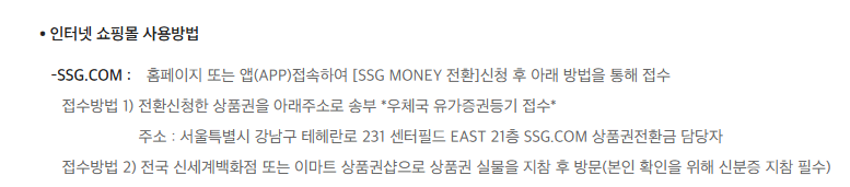 신세계상품권 사용처에 대해선 어느정도 살펴보았으니 신세계상품권 현금교환에 대해서 마지막으로 알아보겠습니다. 상품권의 60% 이상을 사용한 경우, 남은 금액을 현금으로 교환할 수 있습니다. SSG페이를 통한 현금화 방법도 있으며, 이 경우 5%의 수수료가 발생할 수 있습니다. 신세계백화점이나 이마트 고객센터를 통해 현금 교환이 가능하며, 1만원 이하 상품권은 80% 이상 사용해야 합니다. 상품권의 유효기간과 사용 조건을 꼭 확인하시기 바랍니다. 이러한 현금교환 옵션은 상품권의 활용도를 더욱 높여주는 매력적인 기능입니다.