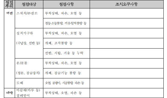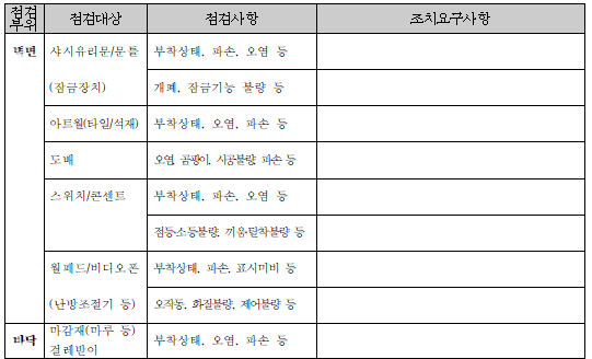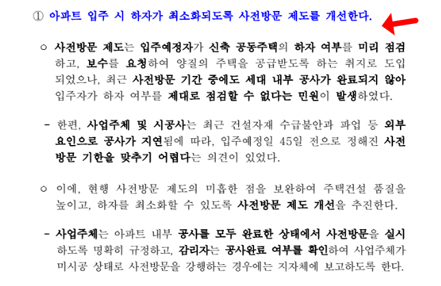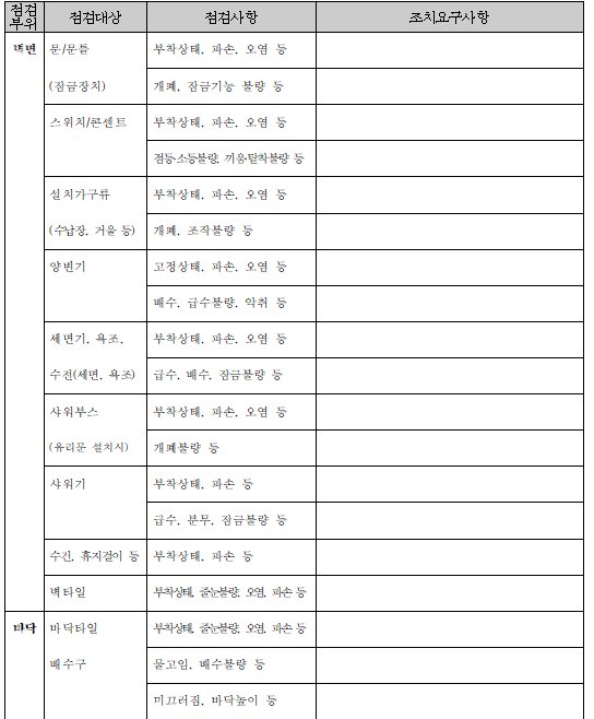 아파트 입주 전에 꼼꼼한 점검은 매우 중요합니다. 사전점검을 통해 시공 과정에서 발생한 하자를 발견하고 수정을 요청할 수 있기 때문이죠. 이는 입주 후 생활의 질과 직결되는 문제입니다. 또한, 사전점검 시 발견된 하자는 대부분 무상으로 보수받을 수 있기 때문에 꼭 요구해야되는 부분이죠. 그리고 입주 후 발생할 수 있는 불필요한 분쟁을 미리 예방할 수 있다는 점에서도 중요합니다. 하단의 링크를 통해 국토부에서 제공하는 표준점검표를 다운로드 해보시기 바랍니다!