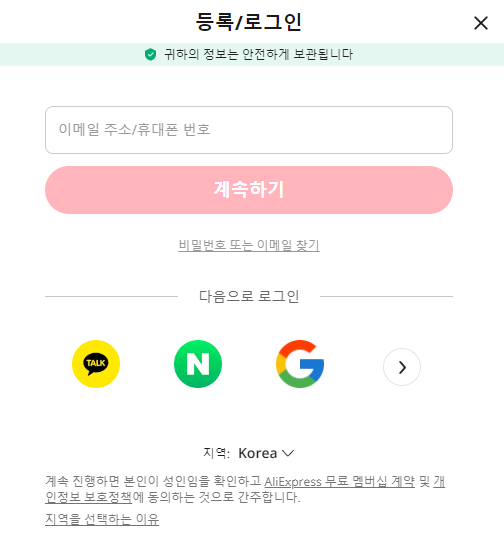 홈페이지 우측 상단에 보시면 로그인/회원가입 버튼이 있습니다. 마우스를 올리면 "회원가입하기" 글자가 생성되는데 알리 아이디가 없으신 분들은 만들어주세요. 본인이 가지고 있는 카카오, 네이버, 구글 계정으로 연동시켜 만들 수 있어서 편리합니다. 아이디가 있으시다면 로그인을 해주시기 바랍니다!