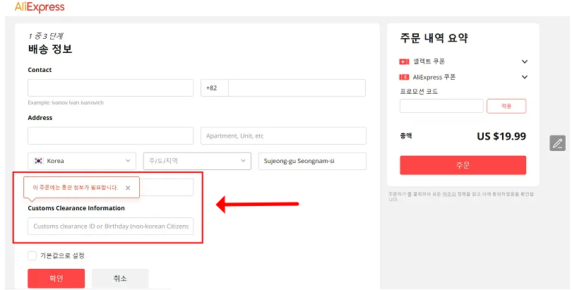 알리익스프레스 구매방법이 한국 사이트와 다른 점 하나는 "개인통관고유부호"를 입력하셔야 된다는 점입니다. 알리 사이트에 입점한 한국배송 마켓은 통관부호가 필요없지만, 대부분 알리 제품은 중국에서 오기 때문에 해외배송에 해당합니다. 처음 신규가입을 하셨다면, 배송지를 입력하는 단계에서 통관고유부호를 입력하셔야 합니다. 만약 이 번호가 없으시다면 관세청 전자통관시스템에서 신규발급을 하시면 되겠습니다.👇