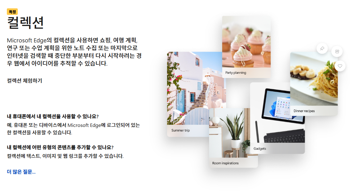 엣지 브라우저 다운로드 후 사용해보시면 크롬과 비슷하면서도 다른 점을 느끼실 수 있을 거예요. 엣지는 크롬의 장점은 그대로 가져오면서 몇 가지 특별한 기능을 추가했습니다. 예를 들어, '컬렉션' 기능은 웹 서핑 중 필요한 정보를 쉽게 저장하고 정리할 수 있게 해주죠. 또한 '세로 탭(수직 탭)' 기능은 화면을 효율적으로 사용할 수 있게 해줍니다. 이런 점들이 엣지만의 매력이라고 할 수 있겠네요.
