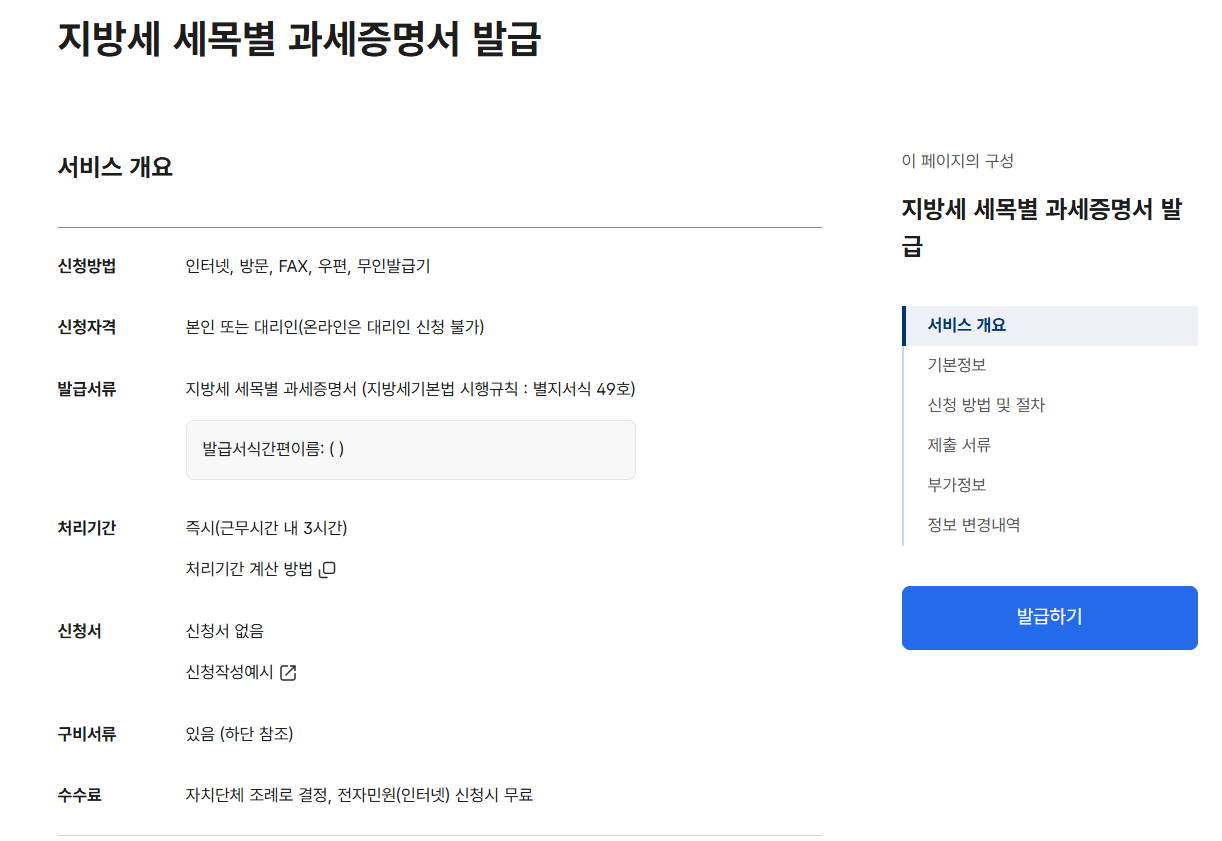 인터넷으로 연말정산을 위해 무주택확인서를 뽑으시려면 또 다른 방법은 정부24 웹사이트를 활용하는 것입니다. 본인인증 후 '지방세 세목별 과세증명서'를 발급받으면 무주택확인서와 동일한 효력을 가지게 된다고 합니다. 특히 본인의 청약통장 은행과 상관없이 누구나 쉽게 이용할 수 있다는 장점이 있는데요. 공동인증서나 간편인증 등을 통해 빠르게 발급받으실 수 있습니다. 아래의 링크를 참고하시기 바랍니다.