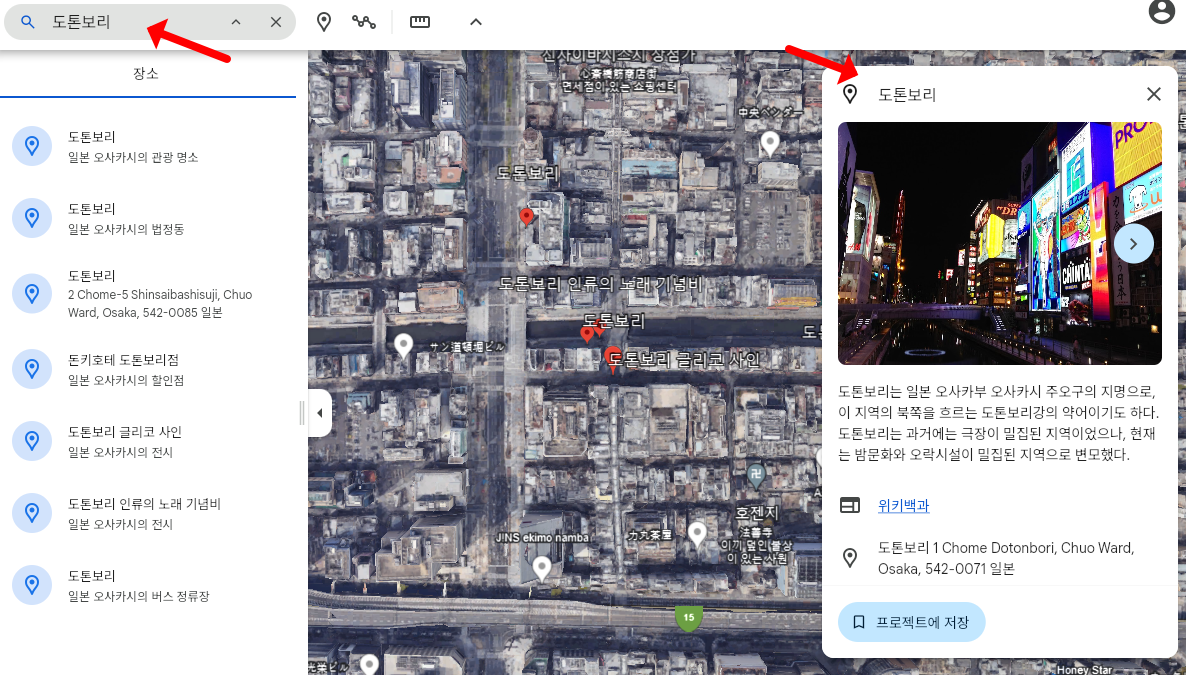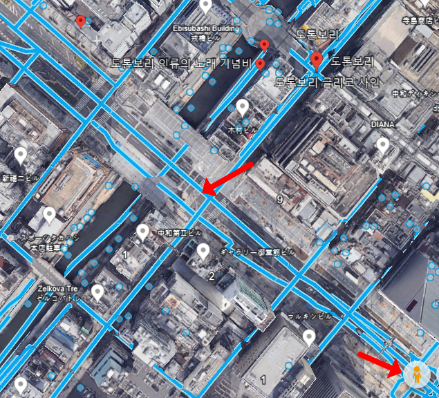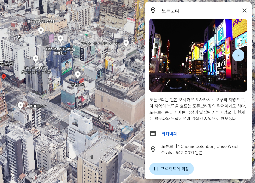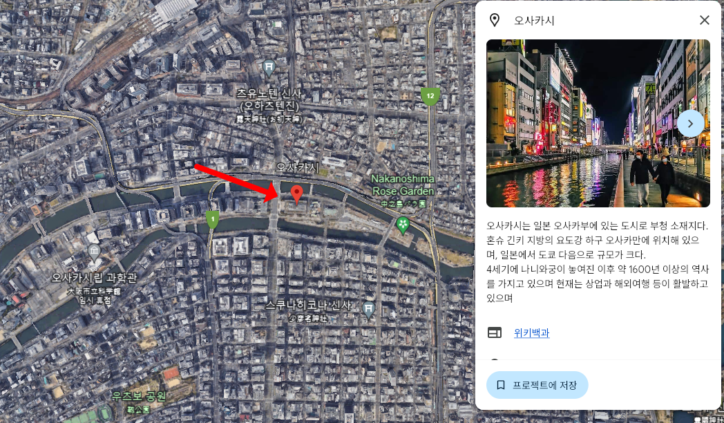 구글어스로도 오사카 지도 한글판으로 이용이 가능합니다. 이는 구글에서 제공하는 3D Map 프로그램으로 보시면 되는데, 놀랍게도 건물의 입체감과 높이 등도 볼 수 있고 구글지도와 연계하여 로드뷰도 제공하고 있습니다. 검색 기능이 있어 검색했을 때, 위치에 대한 간략한 정보도 확인할 수 있습니다. 위성사진의 2D 화면으로 지도를 보는 것이 아쉬우셨다면 구글어스를 활용해보시기 바랍니다.