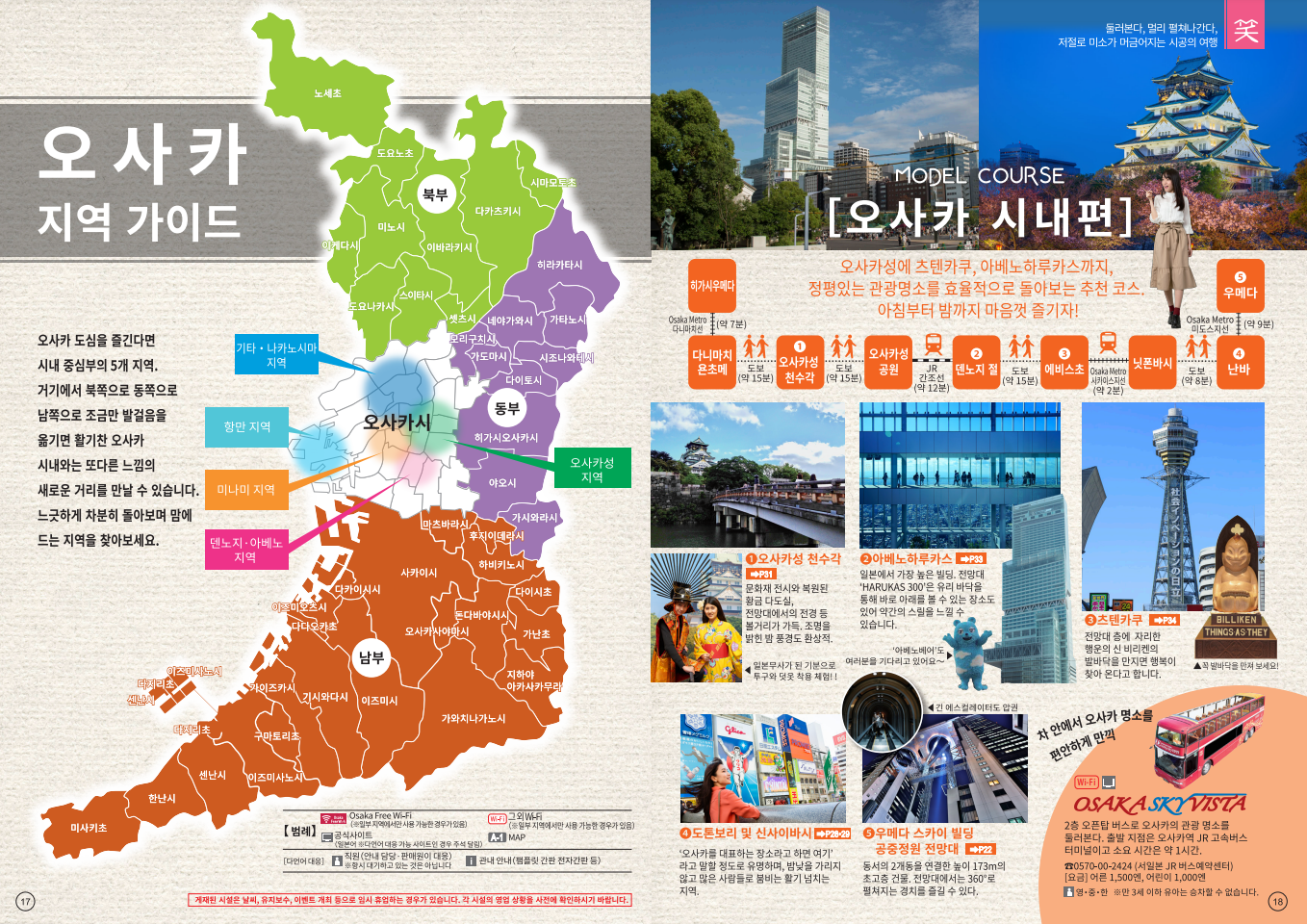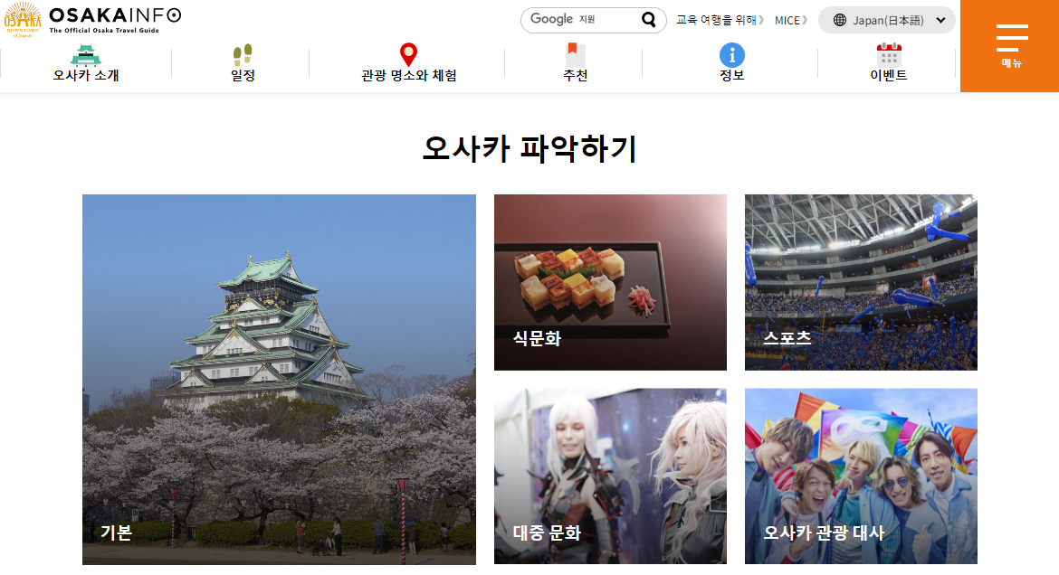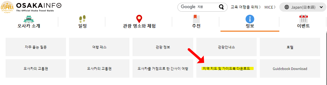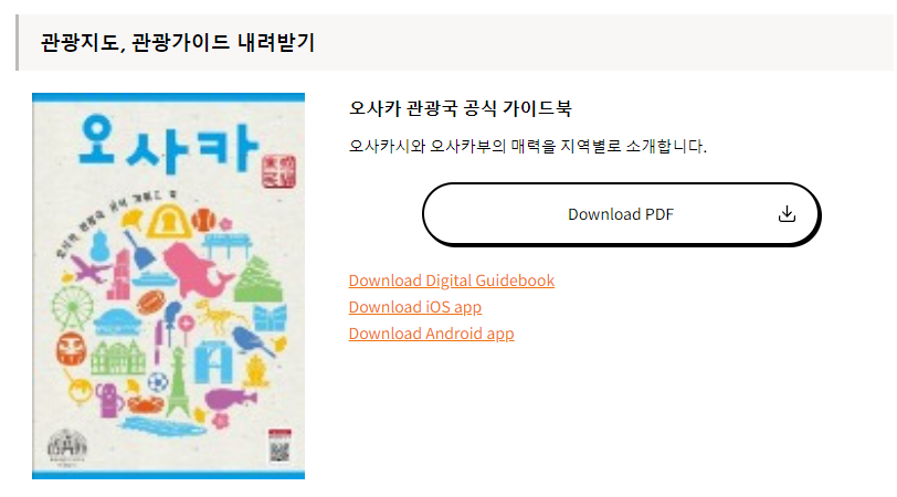 앞서 소개해드린 사이트와 동일한 곳입니다. 오사카에서 공식으로 운영하는 관광국 홈페이지로, 가이드북을 제공해주고 있습니다. 카타(우메다 주변), 미나미(난바 주변), 오사카성, 덴노지, 아베노지역, 항만 지역 등 주요 거점 지역에 따라서 PDF를 제공해주고 있어 관광 시 매우 유용하며, "오사카부 전역", "노선도" 까지 한눈에 살펴보실 수 있습니다.