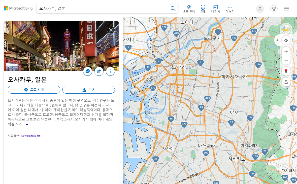 마이크로 소프트에서도 지도 서비스를 제공하고는 있지만, 오사카 지도 한글판이라고 부르기에는 약간 무리가 있습니다. 매우 유명한 관광지만 한글 번역이 완료된 모습을 보여주고, 나머지는 일본어 원어로 적혀있기 때문에 반쪽짜리 지도라고 보셔야 할 것 같습니다. 일본어를 사용할 줄 아신다면 참고적으로 활용하시면 좋을 것 같네요.