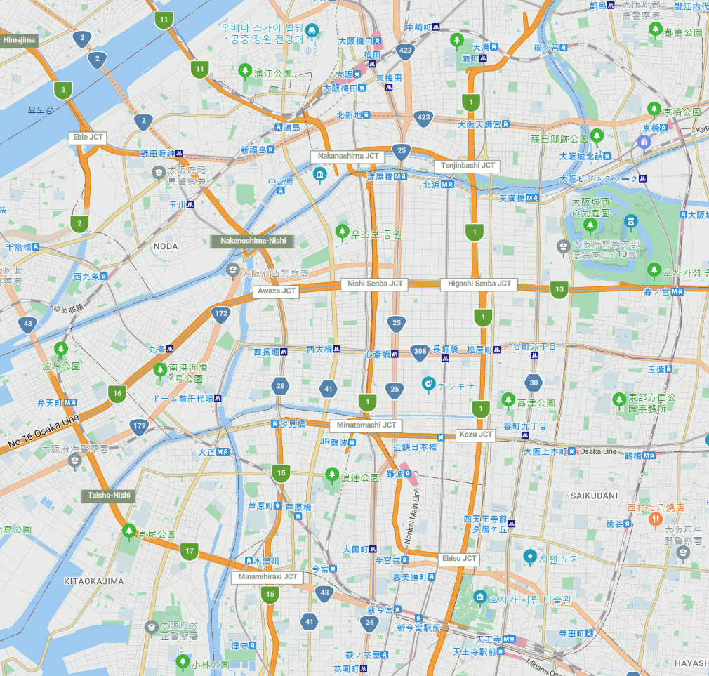 개인적으로 추천드리는 오사카 지도 한글판은 단연코 구글 지도입니다. 계획을 짜는데는 오사카 관광청의 가이드북 자료가 도움이 많이 되지만, 실제 여행하실 때에는 구글맵이 최고입니다. 일본은 구글재팬이 자리잡은 지 매우 오래되었고 매우 상세한 인프라를 담당하고 있습니다. 따라서 실시간 교통정보, 길찾기 등이 매우 편리하며, 맛집을 검색할 때도 구글을 이용하는 수 많은 사람들의 솔직 리뷰들이 담겨있어 식당을 찾는 것도 매우 편리합니다. 한글화가 너무 잘되어 있습니다.
