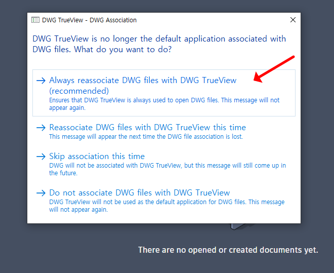 설치가 완료되었다면 Start를 눌러서 뷰어를 실행해보세요. 첫 실행 시 팝업창이 뜨는데 "Always reassociate DWG files with DWG TrueView (recommended)" 를 선택하시면 됩니다.