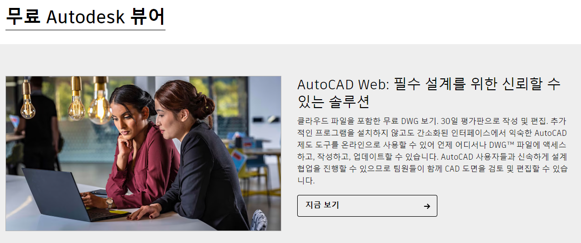 오토캐드 뷰어 한글판 무료 다운로드 하는 방법을 알려드리도록 하겠습니다. 작도나 스케치 기능을 포함한 오토캐드의 전 기능을 사용하는 것은 당연히 비용이 들지만, 뷰어 기능만을 활용하는 것은 무료로 가능한 프로그램이 많습니다. 특히 오토캐드에서도 공식적으로 제공하고 있는데요. 하단의 썸네일 이미지에 링크를 걸어드릴테니 클릭해서 접속해보시기 바랍니다.