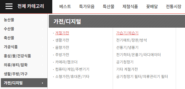 1. 생활 필수품과 가전제품: 생활용품, 가전, 디지털 제품, 계절가전 등을 포함해 일상 생활에서 필요한 다양한 상품을 제공합니다.