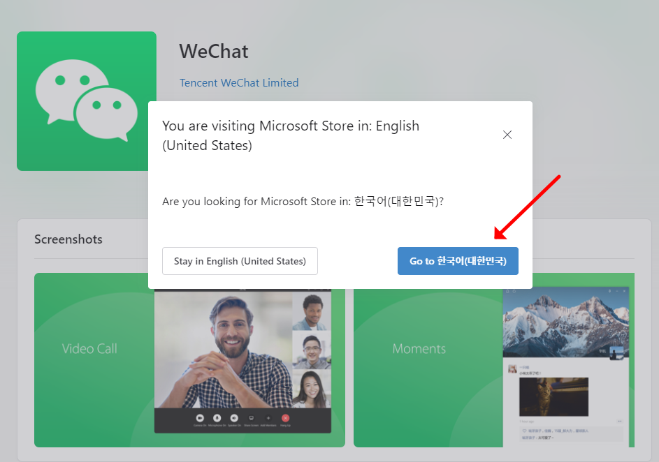 - 마이크로소프트 앱 스토어로 이동됩니다. "Go to 한국어(대한민국)" 버튼을 클릭합니다.
