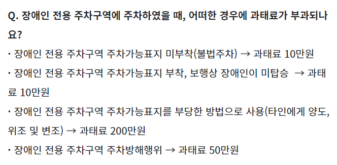 - 표지 위조 또는 부정 사용 - 장애인 주차 표지를 위조하거나 부당하게 사용할 경우, 200만 원의 과태료가 부과됩니다