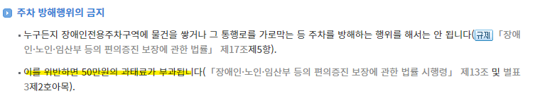 - 주차 방해 및 표시 훼손 - 주차구역 표시를 훼손하거나 주차 방해 행위(예: 물건 적재)로 인해 과태료는 50만 원이 부과됩니다