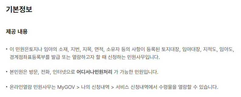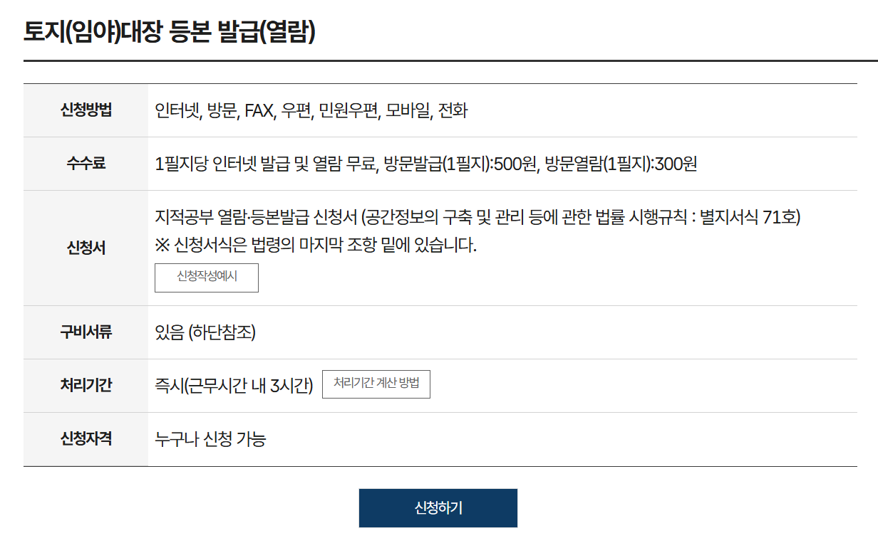 위 제공드린 링크를 이용하시면 되겠으나, 추후 정석적으로 접근하시려는 경우 정부24 사이트에 접속한 후, "민원서비스" 메뉴를 클릭 후, 검색창에 '토지(임야)대장' 검색하시면 됩니다. 로그인 후 토지 정보를 입력하고 열람 신청을 하면 바로 화면에서 확인할 수 있어요. 생각보다 간단하지요? 아 참고로, 본인 소유의 토지가 아닌 경우에는 수수료가 발생할 수 있으니 주의하셔야 합니다. 열람한 내용은 바로 출력도 가능하지만, 법적 효력은 없다는 점 기억하세요.