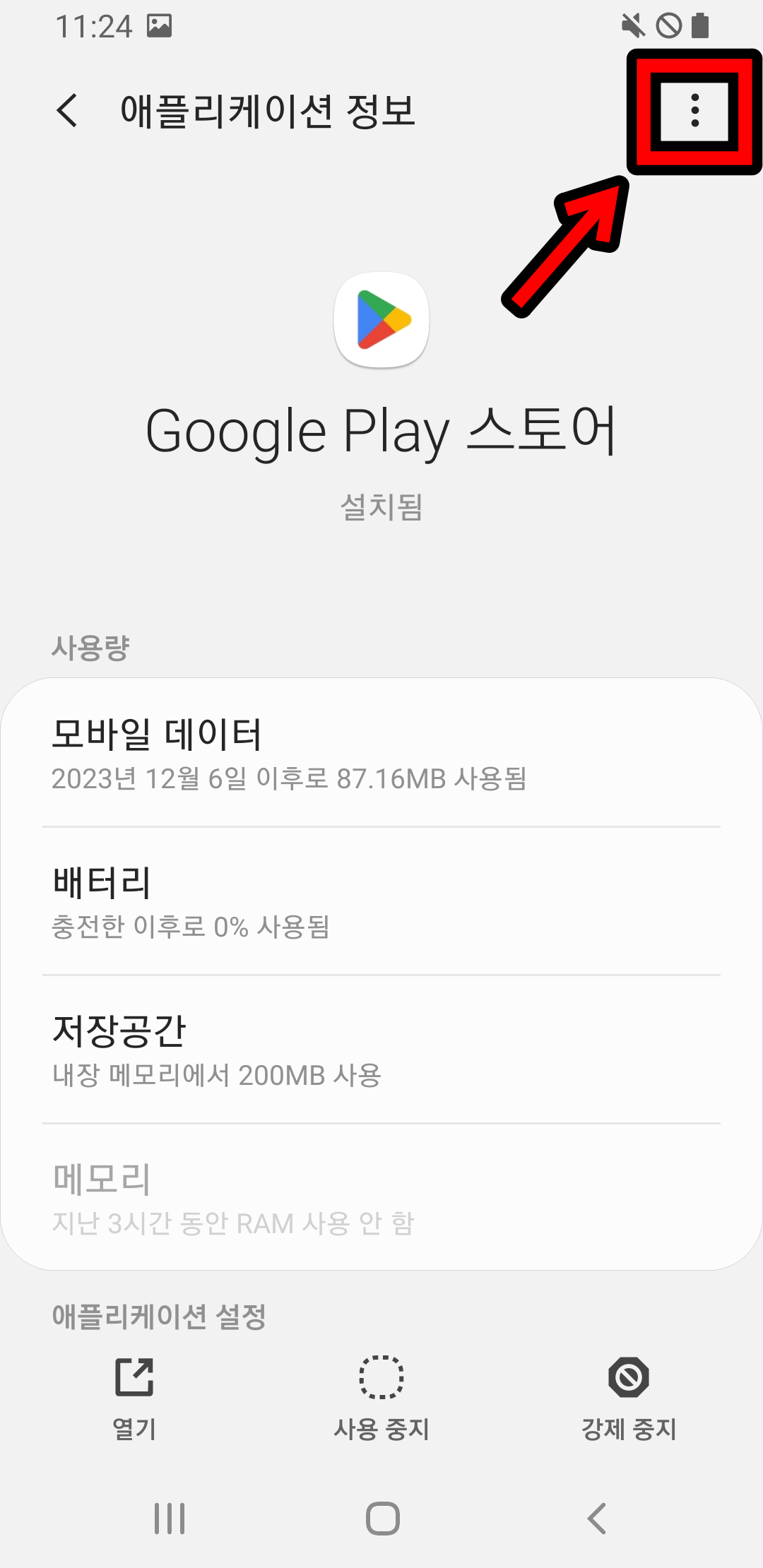 - 설정 > 애플리케이션 > Google Play 스토어로 이동 후, 우측 상단의 더보기(점 세개 아이콘)을 클릭합니다.