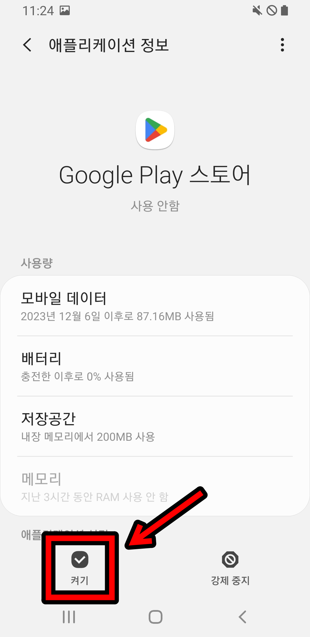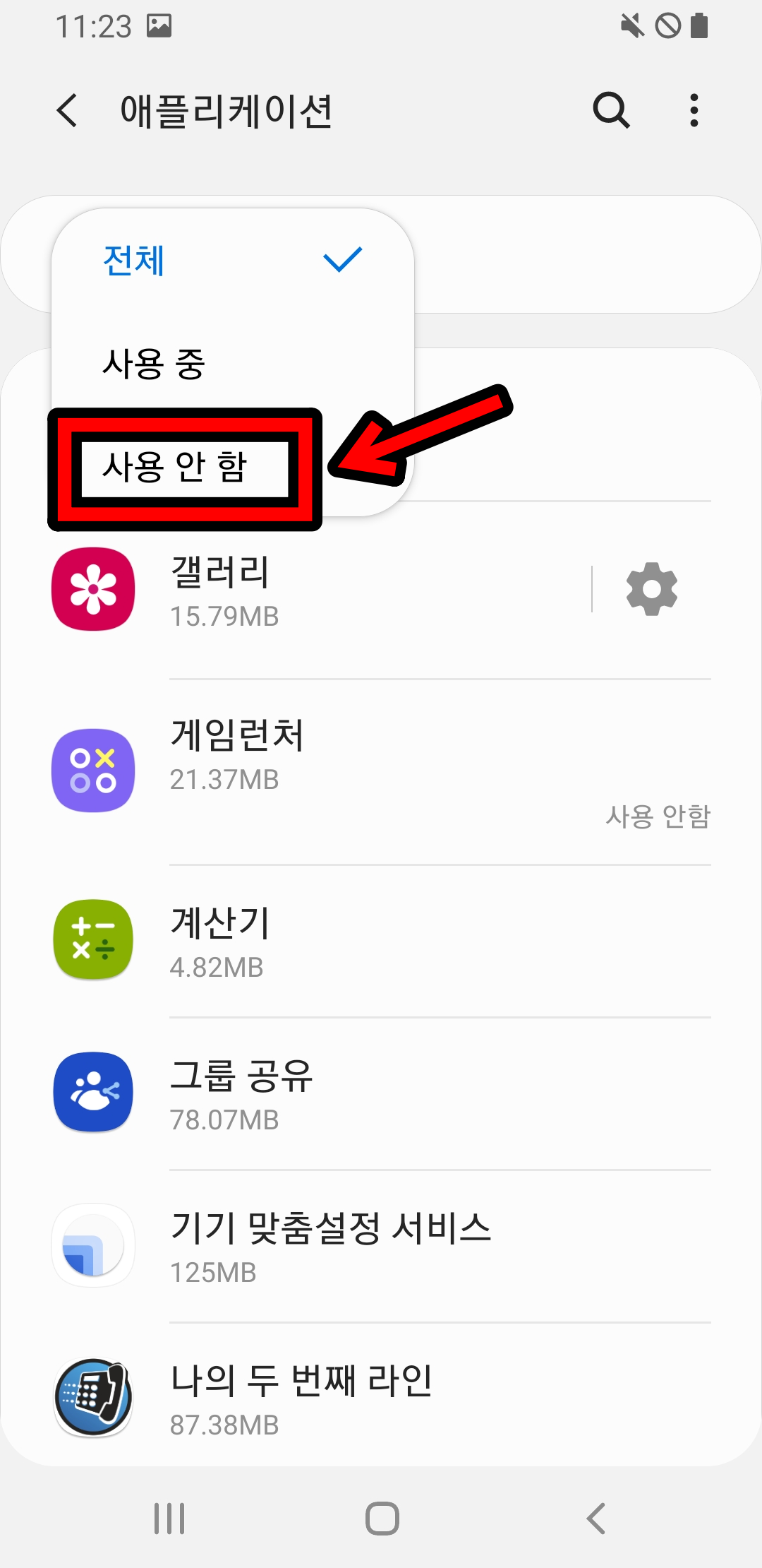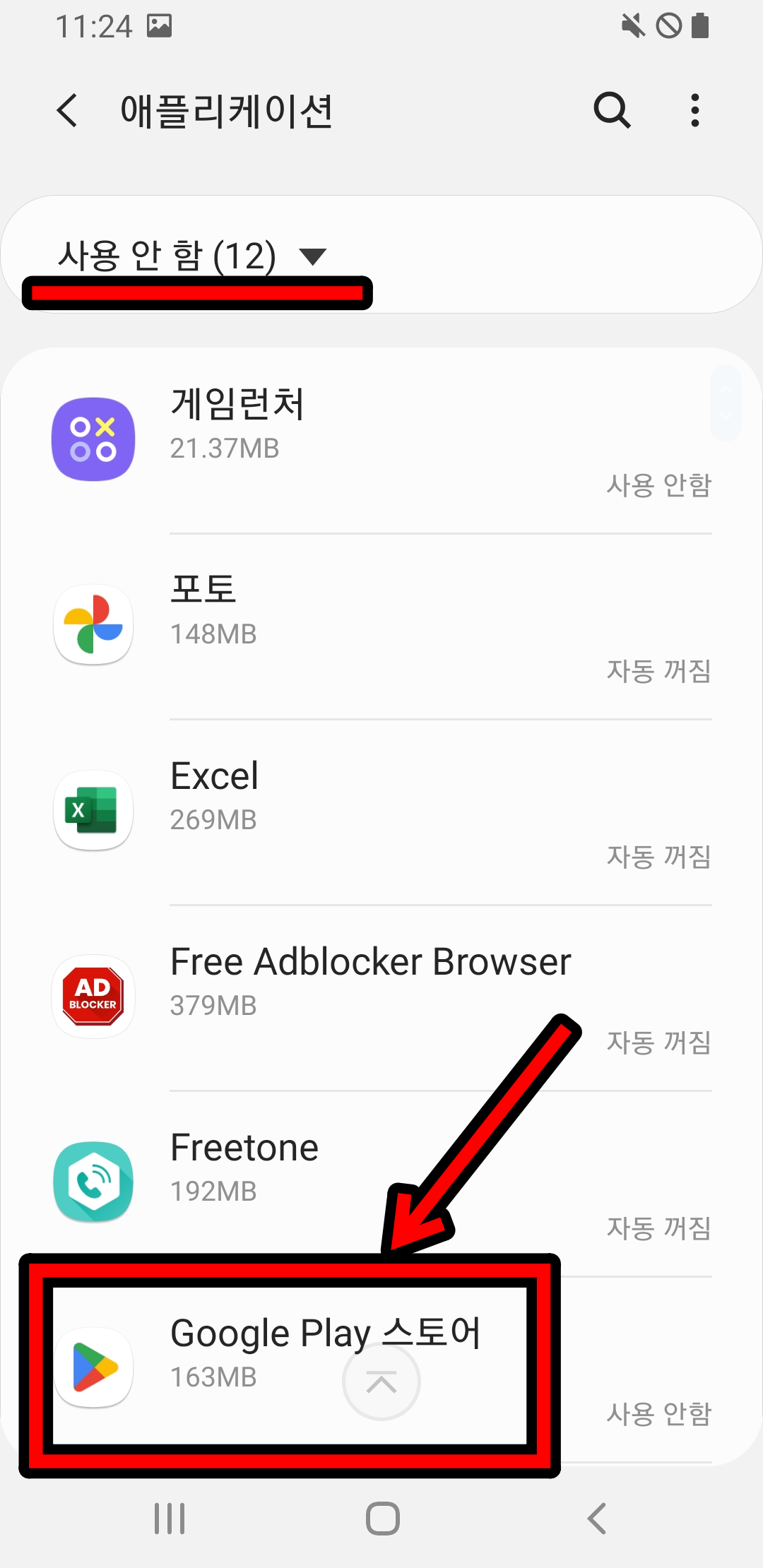 - '전체', '사용 중', '사용 안 함' 카테고리에서 '사용 안 함'을 클릭하였을 때 'Google Play 스토어'가 있다면 눌러서 앱 정보를 엽니다.