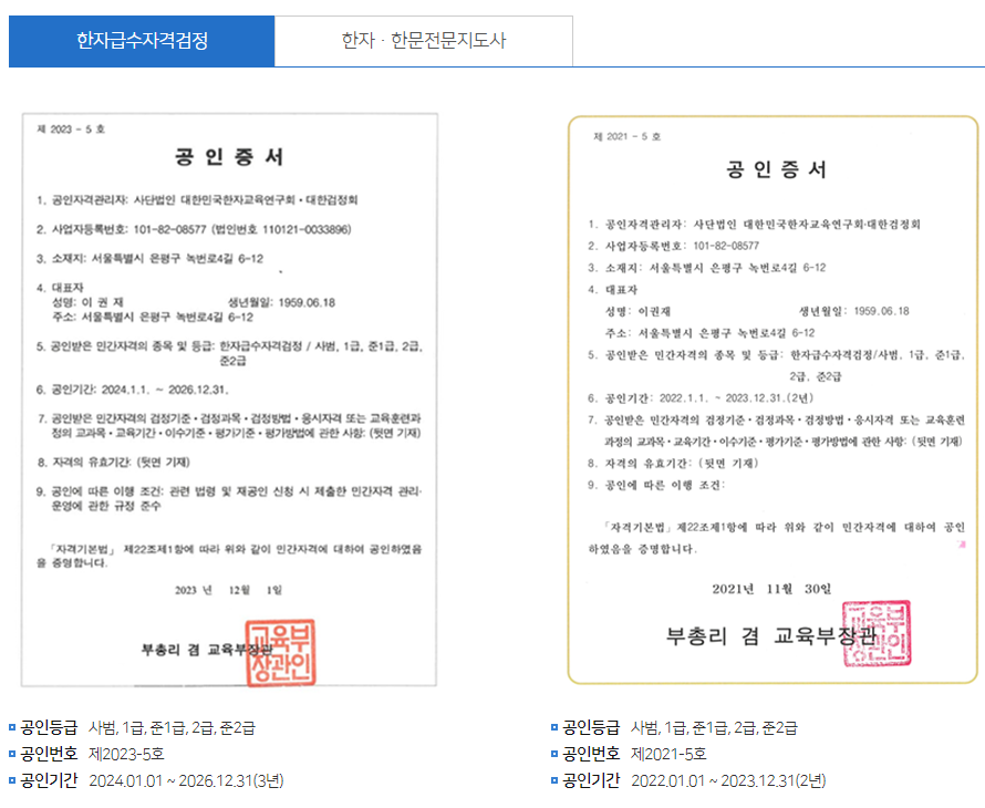한자능력검정시험 한자급수시험의 자격증은 교육 분야에서 특히 유용합니다. 초, 중, 고등학교 한문 교사 임용 시험 준비에 필수적이며, 한자 교육 관련 기관에서도 필요로 하는 자격증입니다. 또한, 일부 대학에서는 입시에서 이 자격증을 인정하여 입학 사정에 반영하기도 합니다