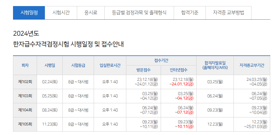 (*참고로 한자능력검정시험 한자급수시험은 시험 접수 기간이 정해져 있다는 것을 꼭 유의하시기 바랍니다.)