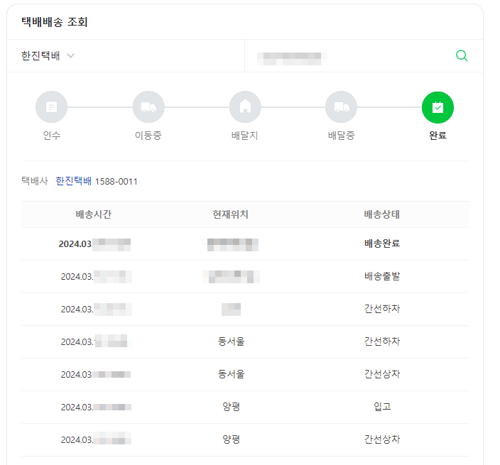 naver 에서도 한진택배 실시간 배송조회가 가능합니다. 검색창에 '배송조회'라고 입력 후 택배사를 선택해주고 마찬가지로 운송장번호 입력 후 결과를 확인하시면 됩니다.