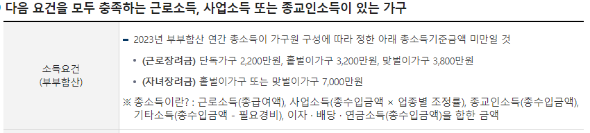 - 홑벌이 가구: 연간 총소득 4만 원 ~ 3200만 원 미만.