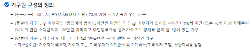 이 내용을 알아보기 전, 자격이 먼저 되는지 확인하셔야합니다. "단독가구", 홑벌이가구", "맞벌이가구" 총 3가지 케이스로 나뉘게 되는데, 이 가구의 정의가 어떻게 되는지 먼저 살펴보겠습니다.